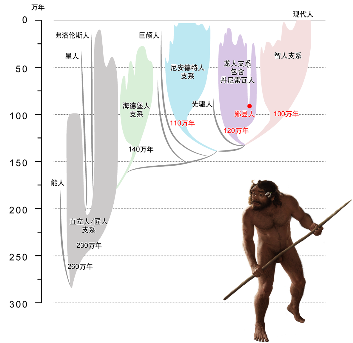 郧县人并非直立人,而是与丹尼索瓦人密切相关的龙人支系的早期代表。这说明早在100万年前,人类祖先已经分化成多个独立演化的群体,其分化时间之早、程度之复杂,远超我们过去的想象。根据这一新的谱系框架,亚洲地区多数中更新世人类化石——包括大荔、金牛山、华龙洞、许家窑、夏河、澎湖及丹尼索瓦洞穴出土标本,以及发现于松花江哈尔滨江段的龙人正型头骨——都可归入龙人支系。该支系与智人拥有最近的共同祖先。