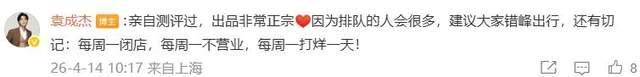 袁成杰也不忘贴心提醒食客:因排队人众多,建议错峰出行,并再三强调“每周一闭店,每周一不营业,每周一打烊一天”。这一细节,反而增添了小店恪守节奏、不盲目扩张的个性色彩。