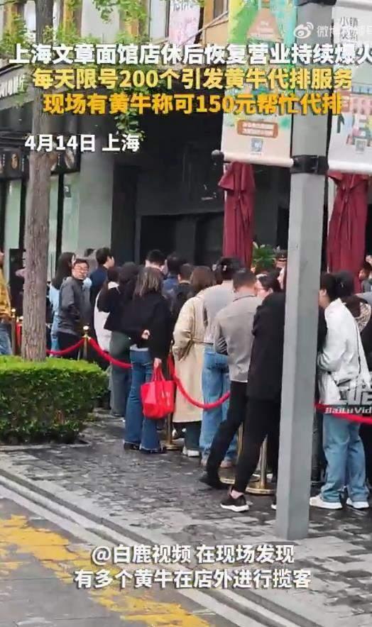 火爆人气催生了独特的“黄牛经济”。4月14日,面馆外出现多个专职揽客的“黄牛”,他们声称有人清晨七八点便开始排队,二手平台甚至出现了500元的代排队服务。尽管店家为保障运营秩序,已采取限号措施,每天仅放号200个,上下午各100个,但限号后依然供不应求。